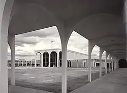 While continuing to conduct services in the Main Street location, the parish began raising funds for a permanent structure to be built on the donated property. Part of the Arizona Missionary Jurisdiction, the church was granted parish status by Bishop Arthur Barksdale Kinsolving II on November 1, 1955 (All Saints Day). On May 2, 1958, the church was officially incorporated in the state of Arizona. Later that year, the Missionary District officially became a Diocese of the Episcopal Church.[2] In September 1959 Henry B. Getz became the rector of the parish.[7] In 1959, the design and construction of the new church building was awarded to T.S. Montgomery.[2] In September 1960 it was announced that the parish had accepted the conceptual drawings for the church complex to be built on their 10-acre parcel. The design included four buildings. A 460-seat main sanctuary, a 60-seat chapel, and offices would occupy the main building; a meeting hall with kitchen facilities would be a second building, with the remaining two buildings housing 24 classroom and small meeting rooms. The estimated cost of construction was $456,950.[6] The sanctuary's original design contains rhythmic columns and arches, a high ceiling and a raised circular altar.[8] Construction on the current sanctuary, along with the chapel, offices and one of the two 12 room education buildings began in 1960, with the official ground breaking occurring on December 4.[9] It was undertaken by the Redden Construction Company of Phoenix. Construction was completed the following year and the first service in the present sanctuary was held on September 11, 1961. On November 12, 1961, all the new buildings were dedicated.[2][8] The sanctuary was "originally designed to have the acoustic properties of larger cathedrals".[10] 1961 also saw the creation of the Church's "Memorial Acceptance and Fine Arts" committee (MAFA). Composed of between seven and nine congregation members with fine arts interests, the committee is responsible for approving all religious items, artwork, and decorations for the church. The first work commissioned and completed was a baptismal font, designed by Paradise Valley artists, Allen Ditson and Lee Porzio.[11][12]