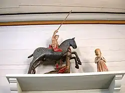 There are two replicas of the sculpture. One is in St. Catherine's Church in Lübeck and the other is on Köpmantorget in Stockholm. The copy in Stockholm is made of bronze and was inaugurated on 10 October 1912, the anniversary of the Battle of Brunkeberg.[7] The sculpture also inspired numerous other contemporary (albeit less elaborate) wooden depictions of the same subject in Sweden, Finland and Germany.[1][2] In Sweden, around thirty wooden sculpture groups depicting the theme of Saint George and the Dragon and made relatively soon after Notke's sculpture still exist. Several are today in the Swedish History Museum but others still in situ. In Finland the number is slightly more than twenty. Although most of these were made by local or unknown artists, a number have been attributed to Henning van der Heide, Haaken Gulleson and Henning Roleve. The state of preservation of these sculptures are very varied.[9]