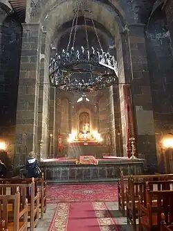 The church grounds were enhanced with tuff block paving and a basalt drinking fountain designed by architect Rafayel Israyelian.[152] Israyelian also designed a new altar table (1960) and chandelier (1967). The altar featured an altarpiece of the Virgin Mary by Hovhannes Minasyan,[40][153] which Ruben Angaladian hailed as "one of the finest works in the history of Armenian painting."[154]
