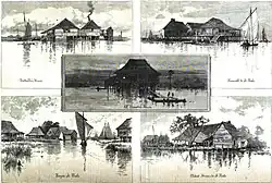 The Manilamen lived in small houses supported above the water by stilts in a similar style to the nipa huts of the Philippines.[1][6] Wood needed to construct dwellings had to be acquired elsewhere as it could not be easily found in the swamps. The palmetto and woven-cane construction often did not withstand the harsh climate of marsh and had to be repaired or replaced frequently. Windows were draped with netting to protect from mosquitoes and other biting insects. Dwellings lacked furniture including tables, chairs, and bed frames.[19] Mattresses were stuffed with dried Spanish moss which had been a common practice in the region and had even been used to upholster the Ford Model T.[19][24] The mattresses were laid upon a series of shelves mounted against the walls. According to Hearn, the fishermen slept at night "among barrels of flour and folded sails and smoked fish."[19]