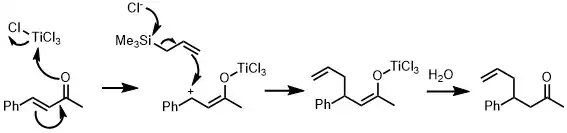 Allylation of a carbonyl ketone (compound containing a ketone group and two different functional groups) has been shown. In the given reaction, the electrophilic compound (carbon with a ketone group) is treated with titanium tetrachloride, a strong Lewis acid and allyltrimethylsilane. According to the general principle, the Lewis acid first activates the electrophilic carbon in presence of allyltrimethylsilane which then undergoes nucleophilic attack from electrons on the allylic silane.[5] The silicon plays the key role in stabilizing the carbocation of carbon at the β-position. The Sakurai reaction is also applicable for other functional groups such as enones, where conjugate addition is usually seen. In figure 2, the Sakurai reaction has been shown using a cinnamoyl ketone. This reaction follows the same mechanism as the previous reaction shown here.