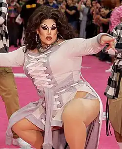For the "Night of 1,000 Beyoncés" runway category, she recreated Beyoncé's red-carpet look from the 46th Annual Grammy Awards (2004).[26] When the runway category was "Rip Her to Shreds", Vulture commented, "Salina gives a touching tribute to her mother, portraying an immigrant crossing the border, but the unfortunate truth is that the drag is not up to the level of the story."[27] For the "Everybody Say Glove" runway, Autostraddle praised the clear vision of the look, despite it not being their favorite.[28] In the finale episode, Salina EsTitties appeared in "an exuberant cake dress with the ass taken out".[29][30]