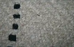 Some red inclusions, found in some blankets, may be made of wool fabric and were used by the Salish weavers in the last quarter of the 1800s. Strips were torn from imported blankets or other materials and used in weaving. It is likely that the introduction of these foreign materials into the weaving was based on colour; strips of richly dyed fabric are common in the later plain or solid style Salish blankets while brightly coloured commercial yarns are included in many of the decorative blankets. In most cases the introduced fabric strips and yarns use colours not available through native plant or mineral dyes.[2]