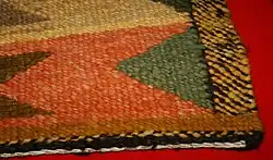 This type of weave, called SWOH-kwah-'tl, is used in the production of the largest blanket styles. The warp and weft are usually of the same material. The weft crosses the warp over two, under two, or over two, under one. At the edge the weft is turned back and woven across in the opposite direction. The order of crossing the warp is changed as each line is woven - it is stepped along one warp, but the system of over two, under one is continued throughout the weave.[5]