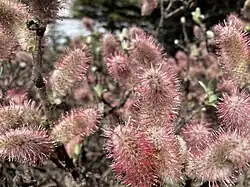 This willow is a shrub reaching a maximum height near 1.5 meters (4 ft 11 in). It may form dense thickets. The stems are reddish-brown in color and the smaller branches may be purplish. The twigs are sticky with resin and have a coating of hairs.[1] The leaves are up to 9.5 centimeters (3.7 in) long and have hairy to woolly undersides. The leaves have a strong "balsamic" scent.[5] The stipules and buds are very oily and will stain a pressing sheet yellow.[2] The species is dioecious, with male and female reproductive parts on separate individuals. The inflorescence is a catkin, the male kind up to 5 cm (2.0 in) long and the female up to 9 cm (3.5 in).[1] The catkins are "fuzzy".[5]