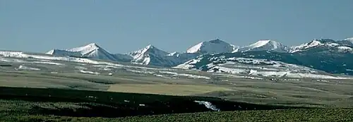 Several major tributary streams provide much of the flow of Salmon Falls Creek as well. The largest tributary is Shoshone Creek, which flows west from the Sawtooth National Forest and enters just upstream of the town of Jackpot. Cottonwood, China, Big, House, Jakes, and Cedar Creeks are some of the other perennial streams in the basin. Since Cedar Creek Reservoir was impounded in 1905, water no longer flows down the creek, whose course is mostly within Idaho. The southern portion of the watershed harbors many springs escaping from the foothills of the mountains, feeding the upper tributary streams.[8] The lower Salmon Falls Creek forms part of the boundary between the Eastern Snake River Plain Aquifer and Western Snake River Plain Aquifer.[9] Most of the southern basin lies between the Jarbidge Mountains and Granite Range on the west and the Sawtooth Mountains on the east, with many peaks rising to 10,000 feet (3,000 m) or more.[10]
