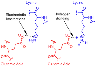 - ^ a b Anderson DE, Becktel WJ, Dahlquist FW (March 1990). "pH-induced denaturation of proteins: a single salt bridge contributes 3-5 kcal/mol to the free energy of folding of T4 lysozyme". Biochemistry. 29 (9): 2403–8. doi:10.1021/bi00461a025. PMID 2337607.