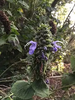 Salvia macrostachya is a rare herb native to Ecuador and southern Colombia, with no specific information about its native habitat. A woody, clump-forming plant, it grows up to 4 metres (13 ft) high on thick stems, with broadly ovate leaves that are approximately 8 to 12 cm (3.1 to 4.7 in) long and wide. The inflorescence is of very dense terminal racemes that are 10 to 30 cm (3.9 to 11.8 in) long. The blue corolla is approximately 2.5 cm (0.98 in) in long.[1]