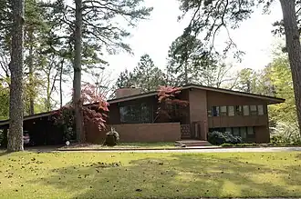 The Sam and Shirley Strauss House is a historic house at 4 Sunset Drive in Cammack Village, Arkansas. It is a single story structure built out of a combination of brick and wood, with a broad shallow-pitch sloping roof. The roof extends on the east side to cover an open carport. At one point in the roof there is a gap, originally made for a tree standing on the property at the time of the house's construction. The exterior is clad in vertical redwood siding, with a variety of window configurations. The house, designed by Little Rock architect Noland Blass Jr., and built in 1963–64, is an excellent regional example of Mid-Century Modern architecture.[2]