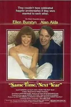 Same Time, Next Year is a 1978 American romantic comedy drama film directed by Robert Mulligan.[2] The screenplay by Bernard Slade is based on his 1975 play. The film stars Alan Alda and Ellen Burstyn (the latter reprising her Broadway role).[3]