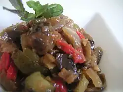 Samfaina is a Catalan - Valencian dish based on diced eggplant and zucchini, a sofrito of chopped garlic and onion and grated tomato, cooked in olive oil. Other ingredients like red and green peppers can be added, as well as herbs like thyme and rosemary.