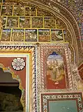 The palace, built by the noblemen of the court of the royal family, is located near the Samode village on the outskirts of Shekhawat. It is built of sandstone at the foot of the Aravalli range of hills (the foremost mountain range of north-western India) with a fortress-like setting. The interiors of the palace are composed in the ancient architectural style of Rajasthan: marble floors, intricately ornamented pillars, mosaic walls (with tiny pieces of small inlaid stones), with luxurious carpets, and decorated with old wall paintings (hunting scenes, floral motifs and so forth). At the entrance gate of the palace is a unique piece of a large-sized treasure chest made of dark wood with marble settings and gleaming glass. The Sheesh Mahal (Hall of Mirrors) is located on the southern side of the palace.[3][9] The frescoes in the Durbar Hall and in the Sultan Mahal are said to be 250 years old.[2] The palace is built on three levels (planned in a sequence of courtyards of increasing height) with a patio on each floor. There is an old ruined fort above the palace from where a panoramic view of the valley could be seen. The fort area is overgrown with vegetation but stone paved paths have been built to reach the fort heights.[5][10] Samode fort was the former residence of the Maharaja. It is said that an underground passage links it to the palace that provided access at times of emergency. It is now approached by a well laid out stone paved path (300 steps). There is also an entry gate to the ruined fort. Two other forts close by complete the circuit of a circular walk from and back to the palace. There is also a small temple, 3 kilometres away from the fort.[3][11]