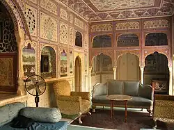 The haveli is built facing north. It has an elegant painted dining room and an air passage. It has a unique ambiance of the historic juxtaposed against a contemporary setting. An elephant ramp, specially constructed at the entrance to the haveli, was laid in 1940 on the occasion of the marriage ceremony of a member of the royal family.[7]
