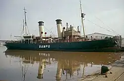 While initially there were talks about saving Sampo and turning her into a museum ship, the cultural and historical importance of the old steam-powered icebreaker was not recognized at that time and the 62-year-old ship was sold for scrap. She was broken up on a small shipyard in Mathildedal in Southwest Finland.[32] Her wooden wheel was salvaged and put on display in the main office of the Finnish Maritime Administration, and the wooden paneling and furniture of the salon was bought by the Finnish yacht club Suomalainen Pursiseura for their club restaurant in Sirpalesaari, Helsinki. In addition the bow propeller shaft of Sampo serves the Finnish winter navigation to this day as part of a sea mark on a small skerry southeast from the island of Utö.[31]