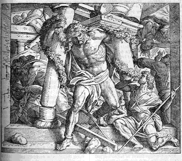 Samson Agonistes draws on the story of Samson from the Old Testament, Judges 13–16; in fact it is a dramatisation of the story starting at Judges 16:23. The drama starts in medias res. Samson has been captured by the Philistines, had his hair, the container of his strength, cut off and his eyes cut out. Samson is "Blind among enemies, O worse than chains" (line 66).
