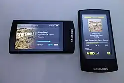 The Samsung YP-R1 (also known as Samsung R1 worldwide or Yepp R1 in Korea or Samsung R'MIX in France because of its DJ feature) is a portable media player made by Samsung, first leaked on the webshop play.com on June 14, 2009[2] and then released at the end of September 2009. It was developed along with the YP-R0 with which it shares several specifications (similar aluminum design, same Linux kernel and SoC). The R1 is available in four different Flash memory capacities: 4 GB, 8 GB, 16 GB and 32 GB. It comes in three different colors: black, silver and pink. It features an aluminum case, a 2.6 inch TFT LCD capacitive touchscreen with a resolution of 240 by 400 pixels, a RDS FM tuner, bluetooth (v2.0 + EDR) and a proprietary USB connector. Several EQ and sound effects are available through Samsung's DNSe 3.0 sound engine.
