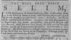 Selim was born in Maryland in 1759, the grandson of Alcock's Arabian, and direct descendant of Selima, Benjamin Tasker, Jr.'s champion mare.[33] Galloway bought Selim as a yearling on credit from Belair Stud.[34] Selim would go on to a successful racing career, and would begin to stand at stud at Tulip Hill in 1763.[35] In 1766, Selim was the victor in a match-race against a Virginia-bred horse, Yorick, in Chestertown, winning a princely sum of 100 pistoles.[36] At the time, the pair were "the two most famous horses on this continent".[37]