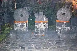 Day of the Dead is the most important celebration in this community, with two days of ritual and cultural events from November 1 to 2.[8] The village and its church graveyard has become famous in the Mexico City metropolitan area for this.[9] In and around the cemetery, thousands of Mexican and international visitors experience the sights, sound and smells of the rituals, cultural events and stands selling food, crafts and other items.[10] The modern celebrations are an extension of the cult of the dead that existed here since pre-Hispanic times. Excavations in this area have revealed a large quantity of stone skulls that used to adorn the facades of homes in this area.[5] Solemn commemoration and festivities do not compete here; both are considered part of the event.[11] In addition to the traditional altars to the dead called “ofrendas”, grave cleanings and decoration, there are also plays, processions, poetry readings, concerts and folk dance. In 2009, the finale was a concert by Susana Harp.[8]