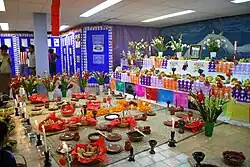 Preparations for this celebration can begin two or three months in advance, when families begin to buy plates and utensils that will be used only for ofrendas and women embroider napkins and tablecloths for the occasion.[5] In mid-October, residents place a large paper star lantern over their doorways, which will remain until November 3. The purpose of this star is to help guide the dead who come back to visit.[2] In the days leading up to the Day of the Dead, fields around the community that have been planted with cempoalxóchitl bloom and the fragrance can be detected. Other aromas, such as those of fruits in season and pan de muerto have given rise to the expression “ya huele a muertos”(now it smells like the dead) or “ya se siente muertitos” (now the dear (lit. little) dead can be felt) indicating that Day of the Dead is near. In the public primary schools, students and teachers arrange Day of the Dead altars, called ofrendas, with the teachers arranging the school's large altar and students creating miniature ones, sometimes with themes. These are placed on public display, with the ofrendas of the Cristobal Colon Primary School the most visited due to the school's location near the church.[12] Days before celebrations begin, tomb cleaning and repair commences.[2]
