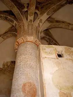 The murals in the vaulting of the church are almost all gone. There are a few fragments left that contained scenes from the life of the Christ and the Virgin: The Adoration of the Magi, Adoration of the Shepherds, Circumcision, The flight into Egypt, and probably the Annunciation and Presentation in the Temple.