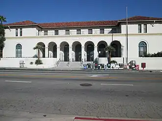 The San Bernardino Downtown Station, located at 390 West 5th Street, is the main post office serving San Bernardino, California. The post office was built in 1931 as part of the decade's federal construction programs; it is one of the few remaining buildings in San Bernardino which predates 1950. Architect Louis A. Simon designed the building, which incorporates a number of architectural styles. The general plan of the building is Beaux-Arts; however, the decorative details are inspired by the Mediterranean Revival and Italianate styles. The front of the building features an arcade with acanthus leaf capitals on the supporting columns and a second-floor porch. A red terra cotta tile roof tops the building.[2]