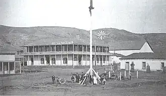 The major buildings and houses of the Pueblo of San Diego were built around the town square.[5] The Pueblo of San Diego was the first permanent Spanish settlement in California. In 1769, Father Junípero Serra's San Diego mission and Gaspar de Portolá's Presidio of San Diego were built overlooking the Pueblo of San Diego. Ships coming to the Pueblo of San Diego sailed into San Diego Bay. The first houses (casas) at the plaza were built in about 1821.[6][7] In 1827 over 30 adobe homes had been built around the San Diego central Plaza, many the homes were for retired Spanish Empire veterans. The only large house in the plaza was La Casa de Juan Bandini. From 1770 to 1822, the Pueblo of San Diego was ruled by a commandant from the Presidio of San Diego under the New Spain. In 1822 the First Mexican Empire took control of the government in the Pueblo of San Diego. The Mexican Secularization Act of 1833 opened up mission land for citizens. In 1835 San Diego had a population of 500 and the First Mexican Republic declared San Diego an official pueblo, city status, and could have its own elected mayor (alcalde), not under military rule of the Presidio. Pueblo status was granted after a petition was sent to Governor José Figueroa and endorsed by Commandant Santiago Arguello. In 1838 San Diego lost its pueblo status because of the declining population.[8] The United States acquired Alta California and San Diego through the Mexican–American War and the Treaty of Guadalupe Hidalgo.[9] On July 29, 1846, at 4 p.m. the first flag of the United States was raised in Plaza San Diego Viejo by Lt. Stephen C. Rowan, a United States Navy commander of US sailors and US marines. Stephen C. Rowan arrived at US sloop-of-war USS Cyan built in 1837. After the war, the United States renamed the plaza, Washington Square.[10][11]