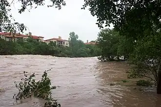 N. Austin Avenue bridge with river at 15 feet. 25-foot high-water mark is from November 2001 flooding.