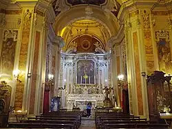 The interior contains a St Michael by Giuseppe Marullo and a Sant'Irene and Sant'Emidio by Vaccaro, the architect. The 18th century ceiling frescoes were painted by Lucio Stabile. In the sacristy is a marble font (1758) by Nicola Tagliacozzi Canale, and two walnut pews (1772) by Nunzia Tancredi with two oval marble reliefs depicting the Adoration of the Shepherds and Adoration of the Magi.