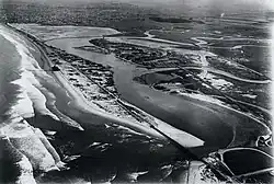 Natural islands in San Pedro Bay include Terminal Island (actually an augmented mudflat and Rattlesnake Island),[6] the site of much of Los Angeles' and Long Beach's port facilities, Mormon Island, the site of an abortive settlement attempt by San Bernardino-based Mormon pioneers in the 1850s, and Smith's Island.[7] Land reclamation operations by Los Angeles have considerably enlarged Terminal Island, as well as linking Mormon Island to the mainland. Deadman's Island sat at a landmark at the foot of the bay, but was removed in 1928 as part of the effort by Phineas Banning to enlarge the harbor. In 1927 an airport, originally called Allen Field and later Naval Air Station Terminal Island, was built on San Pedro's Terminal Island.[8][9][10]