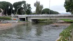 The creek is formed close to the village of Evigno (comune of Diano Arentino) from the union of several streams descending the south-eastern slopes of monte Torre (990 m).[2] Going SSW, a direction the creek will keep till to its mouth, it reaches Diano San Pietro where it gets from the left rio Beste, its main tributary. San Pietro watercourse marks for a long stretch the border between the comuni of Diano Castello (West side) and Diano San Pietro. Not faraway from its mouth, which is located in comune of Diano Marina, the San Pietro is crossed by Genoa–Ventimiglia railway, Autostrada dei Fiori and State highway nr.1 (Via Aurelia).