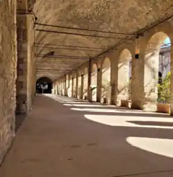 The Sanctuary of Hercules Victor (Italian: Ercole Vincitore) in Tivoli (Italy) was one of the major complexes of the Roman Republican era built on the wave of the Hellenistic cultural influence after the final Roman conquest of Greece (146 BC).[1] It was built just outside the ancient city of Tibur and is the largest of Italic sanctuaries dedicated to Hercules (such as the Shrine of Hercules Curinus), and the second in the whole Mediterranean after that of Cádiz in Spain.[2] It was built between about 120 and 82 BC and was a masterpiece of Roman engineering with many innovations.[3] Further building was done in the Augustan period especially in the theatre area. Augustus administered justice here on numerous occasions, under the arcades of the sanctuary.[4]