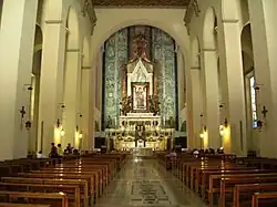 The construction works of the cathedral basilica began in 1952, ending in 1961 with the solemn consecration on Ascension Day: the basilica is the work of the architect Florestano Di Fausto.[12] The facade, divided into three compartments where the same number of entrances open, is covered in white stone and in the center there is a rose window decorated with polychrome glass depicting the coronation of the Virgin.