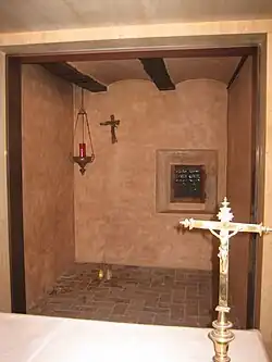 The fame and impact of this monastery is due to the Alcantarine friar Saint Paschal Baylón. He had already visited the monastery in 1587 but was assigned to Villarreal in 1589, where he lived until his death in 1592. That same year, a well of beneficial waters, known as the Pouet del Sant,[2] was dug in the cloister. Upon his death, the friars themselves buried his body in the same church, at the foot of the altar of the Immaculate Conception, due to the fame of sanctity he had achieved in life, and it was there that the faithful venerated his remains. Philip II of Spain approved the process of beatification, a process promoted by his son Philip III. In 1599 the same Philip III and his wife Margaret of Austria visited the sanctuary to visit the tomb of St. Paschal.[2]