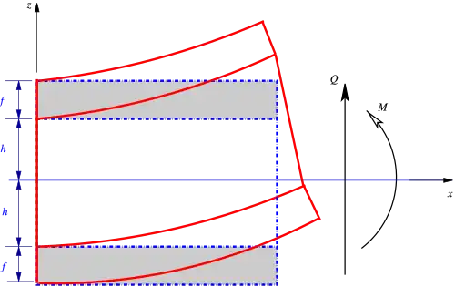 The stress resultants and the corresponding deformations of the beam and of the cross section can be seen in Figure 1. The following relationships can be derived using the theory of linear elasticity:[3][4]
