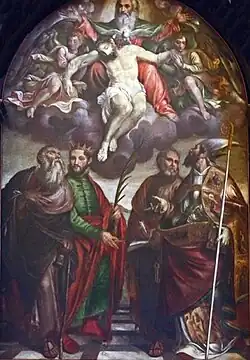 At the bottom of the apse, however, is a canvas, restored in 1988, by Veronese painter Felice Brusasorzi, who had made it around 1573 on commission from the Verità family, who intended to use it for their altar. The subject chosen by Brusasorzi is a Trinity with the interceding Virgin, saints and patriarchs, and for it he was certainly inspired by Titian's La Gloria. Below it is the funeral monument of the Dal Verme family built by Jacopo Dal Verme in the late 14th century.[56]
