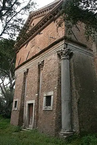 The original construction on the site was a pagan temple or perhaps a tomb from around 160 AD. It is thought to have been dedicated to Ceres and Faustina, wife of Antoninus Pius, although one early historian, Pompilio Totti, believed that it was dedicated to Bacchus.[1] The site lies on land that was formerly part of the Triopio, an estate owned by the Roman senator of Greek origin, Herodes Atticus and his wife Aspasia Annia Regilla. It is thought that the temple was also dedicated to her by her husband after her death at the hands of one of his freed slaves.[2]