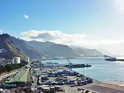 Santa Cruz is located in the northeast quadrant of Tenerife, 210 kilometres (130 mi) off the north-western coast of Africa within the Atlantic Ocean. The distance to the nearest point of mainland Spain is 1,300 kilometres (810 mi). Between the 1833 territorial division of Spain and 1927, Santa Cruz de Tenerife was the sole capital of the Canary Islands, until 1927 when the archipelago was split into the current two provinces.[8][9] The port is of great importance and is the communications hub between Europe, Africa and Americas, with cruise ships arriving from many nations. The city is the focus for domestic and inter-island communications in the Canary Islands.[10]