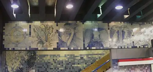 The government of Portugal gave one of the first works of art that adorn the stations to Metro S.A. in the 1990s. This work is called Azulejos para Santiago and is composed by tiles in diverse blue and white tones.