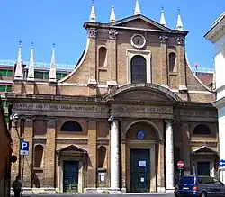 The church is set in the middle of the area that has been called the Prata Mucia ("Fields of Mucius") since about 508 BC; it was here that the Etruscan king Porsena had made his encampment, and that later the Roman Senate donated to Mucius Scaevola as a sign of gratitude of Rome for his heroic actions.[1] The origins of the church are associated with a miracle that is supposed to have happened circa 1488. A sick farmer, afflicted with a serious palsy according to oral history, was healed after praying to an image of the Virgin Mary painted close to the entrance to his own market garden. The event led to popular worship for the painting, and subsequently a small votive chapel was erected, soon followed by a greater church, funded by 12 professional associations (Università).[2] In 1492, Pope Alexander VI allowed the establishment of a confraternity and in 1588 (with a brief dated 20 March) Pope Sixtus V declared it an "archconfraternity" and bestowed on it the rare privilege of asking for the pardon of a person condemned to death, during its titular feast. During the 1825 Jubilee, it was honored with the title of Venerable.[3]