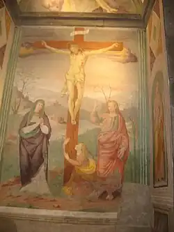 The church can be accessed through two doors: the interior houses there are five chapels and the large semicircular chapel of the altar. The chapels have frescoes depicting the Crucifixion of Jesus, the Resurrection and the Madonna with Child.