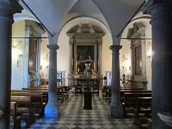 Starting in 1589, with the approval of the municipal authorities, Ganucci used 600 scudi to buy the houses and land on this street.[2] In 1590, with the blessing of the bishop, Ganucci led a procession and prayer ceremony to lay the first stones.[3] The municipal authorities gave permission to the builders to gather stone and materials from various abandoned churches in the region. Worked progressed in building the wall surrounding the monastery and other buildings when Ganucci died in 1595.[4] It appears that after his death, the bishop of Pisa laid claim on the inheritance of Ganucci, claiming that his daughter could no longer be abbess, and that the wall surrounding the monastery was not yet complete. The legal dispute was protracted. In 1607, the onslaught of the plague killed all four executors of the Ganucci estate. Their replacements, with the help of Simone, the widow of Ganucci, argued with the Pisan Bishop, among other points, that all of Montopoli was a walled town, hence apt for a monastery. An appeal to the Grand-Duke Cosimo II de Medici, allowed for the completion of the monastery.[5] Suddenly in 1613, the Papal court in Rome made an argument that the inheritance, which had failed to form a monastery, should be transferred to them. This was strongly opposed by authorities in Montopoli, and ultimately resolved by 1618, when a visit had demonstrated nearly all the facilities and a church necessary for the function of a cloistered convent, including interior church, sacristy, dormitory, refectory, rooms for work, infirmaries, kitchen, and a parlatorio (parlor for conversing with the outer world). The visit made note of all the requirements to cloister the nuns, including windows through which to pass supplies for the kitchen, and screens so that the nuns could attend mass unseen. Ultimately the monastery received a papal bull of approval by Pope Paul V.[6]