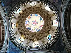 The cupola dome interior's mural, above the stained-glass windows, was painted by Juan Cordero with an image of "God, the Father" surrounded by images representing virtues.[3]