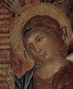 The heads of the angels are alternately inclined inwards or outwards, avoiding a completely profile representation, which was then reserved only for secondary or negative figures. (Giotto also broke that principle.) The angels closely resemble those in the Maestà of Cimabue in the frescoes of the Basilica inferiore di San Francesco d'Assisi. Their bodies are solid, modulated by a delicate chiarascuro that is delicately sfumato (a novel technique of Cimabue's) and the fluidity of their clothes. The red and blue colors of their clothes indicate their substance, according to Renaissance thought: a fusion of fire and air. The angels above turn their heads and sink into the third dimension.