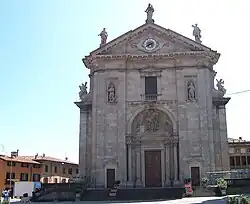 The present church was erected during 1770–1787 in Neoclassical-style by Filippo Alessandri. The imposing façade has monumental Corinthian pilasters upholding a triangular tympanum. The roof line has statuary, crowned with a statue of the Madonna and Child, and the tympanum is flanked by decorative scrolls. The rounded arch of the indented central portal has bas-relief of the Baptism of Christ.