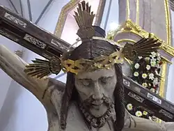 There are murals in the domes. In the sacristy dome is a depiction of La crucificción de Jesucristo (Jesus Christ's crucifixion); the dome symbolizes heaven, whence angels, cherubs and saints look on; the central image is Christ being taken down from the cross.