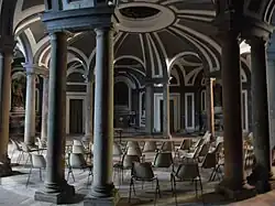 Little survives of this church and its decoration; in 1757 a fire destroyed nearly all the church except for the sacristy, the chapel of the Treasury and the Carafa chapel. The next reconstruction followed a design by Luigi Vanvitelli, and was completed by his son Carlo. The church as we see it today was consecrated in 1774 and the concave facade added in 1782. Ferdinando Fuga helped rebuild the adjacent complex. The gray and white interior is a sober statement of "anti-Baroque", with a theme of coupled Corinthian columns under an unbroken entablature; paired ribs carry the columns upwards in skeletal semi-circular arches that articulate the coffered barrel vaulting. There are works by Giuseppe Sanmartino.