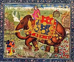 The painting has various Indian and Persian influences. It is Farrukh Husayn's only known feminine depiction, and the subject being a Hindu goddess, would have been wholly foreign to him.[7][9] As such, the goddess has been represented in the form of a Deccani princess, with the depiction closely following her description in the Kitab-i Nauras. Other Deccan elements include the sashes, pendants, and bracelets worn by the figures in the painting.[6] Persian elements in the painting include the iwan arch in the background, as well as the flying paris flanking the throne, shading the goddess. The depiction of these creatures is an allusion to various Persian representations of the queen Bilqis, popular in Shiraz.[6] This reference would have been apparent to the various Iranian noblemen at the Bijapur court.[3]
