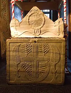 The sarcophagus of Princess Olga from the Tithe Church is a carved slate sarcophagus from the 11th century, found during excavations of the Tithe Church in Kyiv in 1826. Kept in the St. Sophia Cathedral. Some researchers believe that Princess Olga, who is known to have been reburied in the Church of the Tithes by her grandson Prince Vladimir around 1007, was buried there. The sarcophagus is exhibited in Sofia of Kyiv as the “Sarcophagus of Princess Olga”. However, this attribution is questioned by most researchers, although the possibility that Princess Olga could have been buried in the sarcophagus is not completely ruled out.[1]