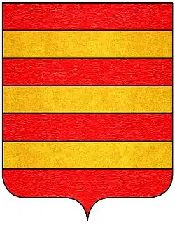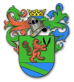 Another group, originally from Enego, obtained citizenship of Vicenza in 1582, and by 1599 they already had coats of arms. This group used at least two other variants of this coat of arms: one with the gold lion and the silver scissors, and another documented in Bassano del Grappa in 1615 at his tomb in the Church of Saint Francis, with the green lion, the gold upper field, the purple band and a red band between the two fields.[38]