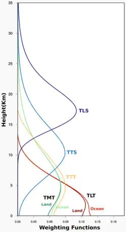 Satellites measure radiances in various wavelength bands, which must then be mathematically inverted to obtain indirect inferences of temperature.[1][2] The resulting temperature profiles depend on details of the methods that are used to obtain temperatures from radiances. As a result, different groups that have analyzed the satellite data have produced differing temperature datasets.